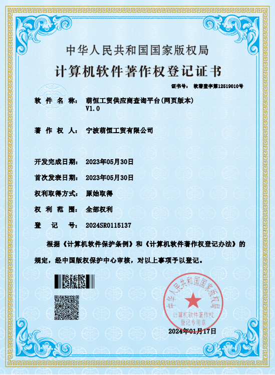 近日,萌恒工貿(mào)供應(yīng)商查詢平臺(網(wǎng)頁版本)獲得了由國家版權(quán)局簽發(fā)的計算機軟件著作權(quán)登記證書。即萌恒享有該軟件的發(fā)表權(quán)、署名權(quán)、復制權(quán)、發(fā)行權(quán)、出租權(quán)、信息網(wǎng)絡(luò)傳播權(quán)、翻譯權(quán)以及應(yīng)當由著作權(quán)人享有的其他權(quán)利。這既是軟件權(quán)利歸屬的有力證明,也是企業(yè)自主研發(fā)能力的客觀憑證。